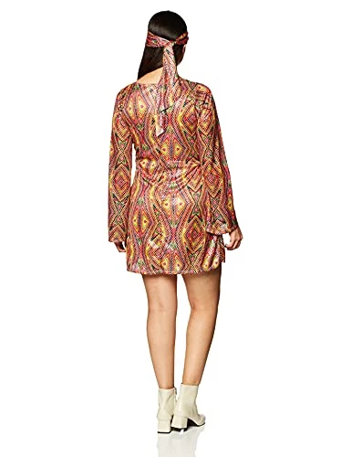 I was concerned with sizing based on other reviews and ordered my regular size and one size up. My normal size was just fine – if anything just a little loose in the middle. It is a mini dress, so yes it is short and comes to about mid thigh. Also, yes it is see through in the light, so I wore shorts underneath. For reference, I am 5’4” and 128 lbs., size small worked for me. It is very bright and very sparkly!! Kind of over the top but fun for a 70s party!!