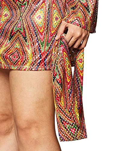 - Multicolored psychedelic print is spangled w/ iridescent silver sequins