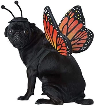 This is SUCH a super cute costume. My dogs weigh between 40-50 lbs and I bought a medium and large one for them to try on. I loved how the wings were thick, but what I truly loved was the fact that the design of the wing was printed on the bottom and top of the wing. This double sided design is great for photo ops because you can tell your dog is wearing a butterfly costume whether they are sitting or laying down.Despite al the pros I had to say about this costume, there was only one negative thing I had to say about it that outweighed all the good things I thought about it. The size is not as advertised. This costume has straps on it that cause this costume to be worn as a backpack on your dog and provide no support on your dogs chest to prevent it from sliding back. The straps for this costume are not sturdy and resemble what you would see in the stretch band of sweatpants. The straps are thin and are too loose for it to stay on your dog after walking or running around some. The straps are so long that I was able to criss- cross them to create a “Chest strap” for my dogs in hopes that I could make it work. After watching my dogs walk/run around in the costume after a bit, I came to the conclusion that the criss-cross method did extend the amount of time it took for the costume to slid back significantly but did eventually slide back because of how long the straps still were on both the medium and large sizes. Although the time it took for the costume to slide back increased significantly after crossing the straps (as pictured), it made the costume look weird and it looked like it might have even been uncomfortable for my dogs I contemplated buying a smaller one but the wing size would not have looked as good on my dogs.If you are crafty and can figure out a way to swap the straps to where there is a chest piece, this costume would be so cute and comfy looking. However, with the price that it is, I personally would not want to spend such a high amount on something that I still need to alter.