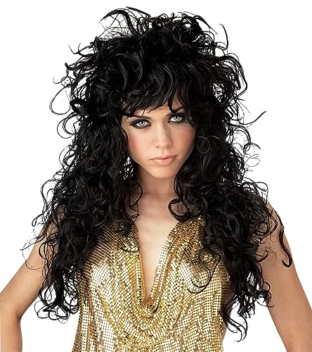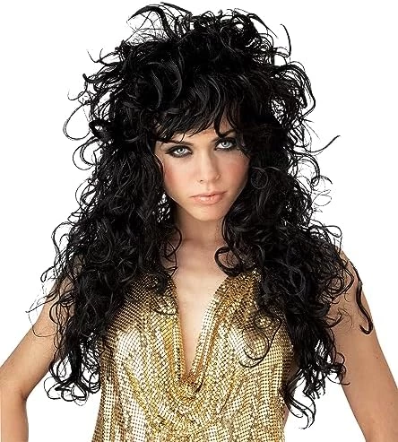 This is such a fun wig for parties and Halloween – with PLENTY of hair! It comes in a very thin (almost invisible) hairnet so when you first take it out of the package it looks all flat and sad. But once you remove the hairnet, just shake it upside down to loosen it up, and it’s BIG and fluffy after that – pretty much like the photo. There’s enough hair in there to “style” it even – pull a bit back and put a clip in it with a big flower, add a bobbie pin or two to pull the bangs back a bit. That sort of thing. You could even divide it into two gigantic ponytails a la Daisy Duke (with black hair). It’s too shiny to look natural, so it’s not for serious wig-wearers but, for the price, I feel like I’ve got a lot of party wig to play with.