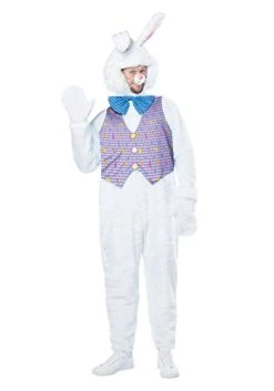 Look who is hopping in for this Easter. The Easter bunny costume includes a plush jumpsuit with attached vest, a bow tie with elastic loop, a bunny nose with elastic string and a pair plush mittens. It comes with both a bunny ear hood piece and a bunny ears headband. Shoes and basket are not included.
