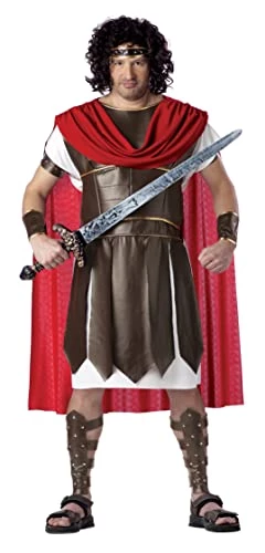Costume includes tunic with vinyl body armor and attached cape, arm bands, cuffs, leg guards and headband.