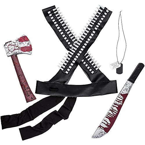 1 axe, 1 machete, 1 bullet belt, 1 weapon belt, 2 dog tags