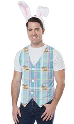 Celebrating with a skip and a hop. The men’s Easter vest kit includes a festive Easter themed printed vest and a furry headband with bunny ears.