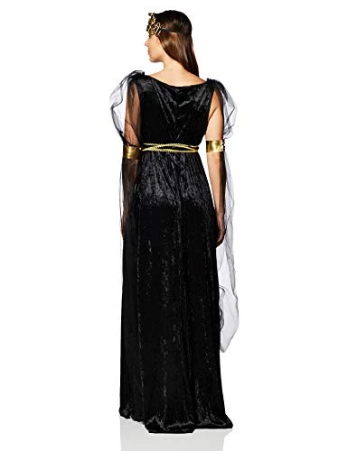 The dress was obviously cheap but not terrible, but expect that your boobs are going to hang out. The gold circles on the arms are HUGE – way too big to possibly stay up, and it only goes about 3/4 of the way around your arm, and the rest is two small strands of elastic. I went back and stitched the elastic tighter so it would stay up. Also, one gold band was attached and the other was not. Also, the tulle on the arms was just a small strip. That being said, this costume (aside from all the boobage), had a flattering fit. It didn’t cling much around the belly, which I really appreciate.I also didn’t like the headpiece at all – it’s heavy and it doesn’t bend around your head. I was ok with that, though because I already had planned for something different on my head.That being said, this was exactly what I was looking for. I embellished it quite a bit and had a great costume. I added a black wig and a big black veil, plus a tulle train that tied around my waist and dragged behind me. I also added another tie around my waist with messy yarn that all stuck together and looked like cobwebs and a longer gold cord.I posted a much too light picture so you can see the dress better.