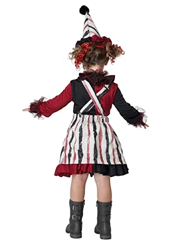 Feeling a Little Funny One of the hardest parts of being a committed clown at the age of 5 is pre-school.Ā Many kids struggle with the big life changes associated with starting their education, but it can be even harder if the other kids see you as ādifferentā. Once they noticed your giant shoes, huge red nose, and rainbow colored, poofy afro, no kid would be able to resist pointing it out. At block-stacking time, those giant clown hands make it impossible to achieve stacks of five or six like the other kids. In fact, youāre lucky if you get 3 before you inadvertently knock it down! Likewise, finger-painting is a huge hassle. Then thereās the difficulty of nap time when your nose squeaks every time you move your head! That classic, old clown get-up is just so outdated⦠Juggling Fashion Trends Thatās why we have invented this Clever Lilā Clown Toddler Costume. Itās a little bit sleeker and more modern than the typical clown-wear that you can get from any Clown-Mart. The muted colors fit in better with the styles of today, so you donāt have to worry about being the weird clown girl with the bright yellow overalls anymore; you can just enjoy your cute, frilly dress! The parasol, hat, and hair also accessorize the outfit perfectly, so you donāt have to worry about making it match on your own. A Beautiful Jester If you are looking for the perfect clown costume for your toddler, then this is the one for you. It is a perfect blend of scary and cute, which means you can brag all night about how well they are juggling those traits! – Dress – Suspenders – Pettiskirt – Shirt – Collar – Pair of Cuffs – Hat