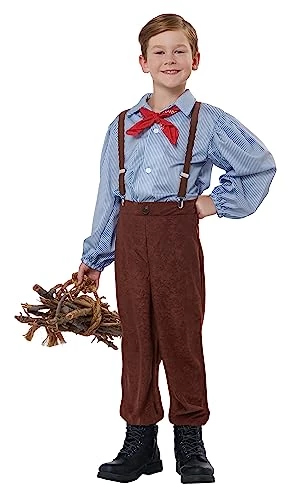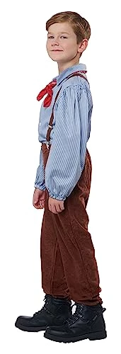 Kids in Ye Olde Days Can you believe what they had to put up with back then? It’s nothing like the struggles that an average kid goes through today! Kids in the pioneer days of the American frontier had to get up early in the morning to feed the chickens. You know, before the rooster even crows! They had to help out with chores in the morning and they had to gather firewood for the winter. They had to cut down stones, plough fields, and they had to plant fields with crops. They couldn’t microwave some pizza rolls when they got hungry and they had to go to the bathroom in an outhouse. And they didn’t even have smartphone to text their friends! Well, your child is probably glad that they live in the modern age. They get access to video games and computers, but it’s never a bad idea to brush up on history to appreciate the nice things that we have today. After all, a few days without Wi-Fi is enough to make anyone recognize how great it is! Maybe this costume is a good way to introduce your young one to the ways of our past! Product Details This Pioneer Boy costume gives your child a taste of what it would have been like living on the prairie. It comes with a striped shirt that has a button-up style front. The sleeve cuffs have elastic for fitting and the wide collar neatly fits the red bandana. The brown pants have a button in front and fit with suspenders for a look that will have your child ready to do some chores on the farm! Great for School Plays! You can accessorize with your own bucket and pair of boots, or just send your young pioneer child on his way. It’s also a great costume for school plays based on American history. – Shirt – Pants – Suspenders – Bandana