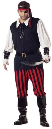 First of all, let me just say I looked at too many costumes to count for my husband, and finally decided on this one. We are dressing up for pirate night on our upcoming Disney cruise and I wanted something cool, but not too expensive. My DH is a bodybuilder and has an enormous chest so I had to order this plus size for him, which fit him on top perfectly, however be advised the pants are HUGE! This isn’t an issue for me because the waist is elastic and I’m just going to take them in a bit for a better fit. The other reviews are right about the belt, it’s definately a piece of crap, (barely long enough to tie on in the back), but it still looks good with the rest of the costume. The wrist cuffs are very cool looking on as are the boot covers. Overall you can’t beat this one for the price. (WARNING: I made the mistake of purchasing the Jack Sparrow bandana with dreds to go with this costume and it looks terrible. The hair attached to the bandana is almost BLONDE not black as pictured!!!) I definately give this costume 5 stars!!!