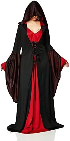 A robe with a dark passion for purple. The deluxe hooded robe features robe with flared sleeves, attached hood, and lace up ties. Necklace and shoes not included.