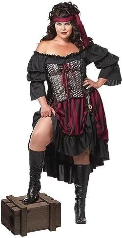 Her appearance does not deceive this lass grants her foes no reprieve. The pirate wench features an elegant dress with an adjustable length skirt, corset with skull pattern print and head tie. Shoes, and jewelry not included.
