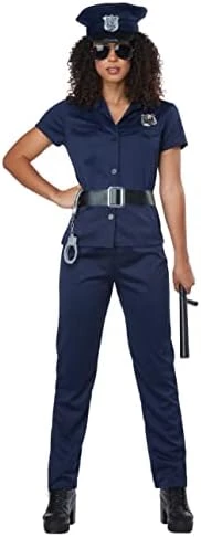This is a Police Costume for Women. – Shirt – Pants – Hat – 2 Badges – Belt – Hand cuffs